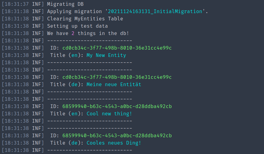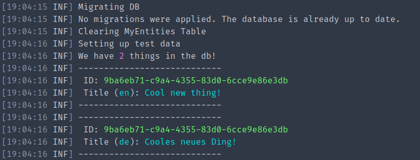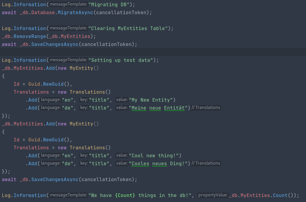My entity I’ll be using to test this with, is very simple, just an id and the translations, making sure to specify to EFCore that it’s of json type.