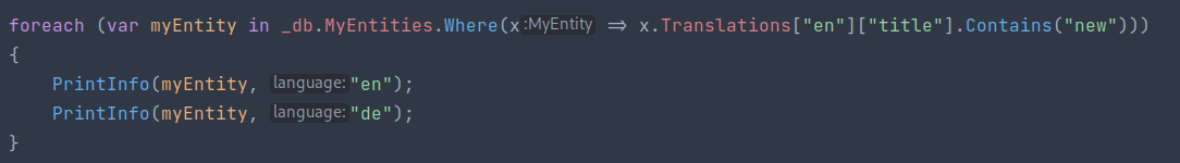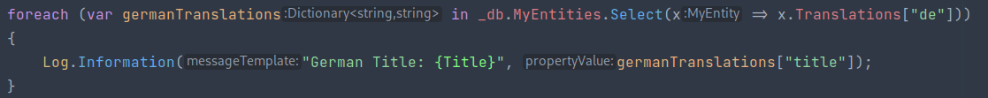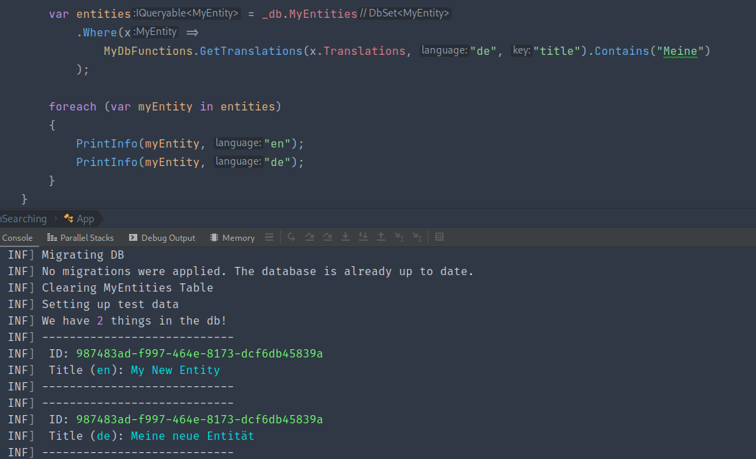Here, we just map the MyDbFunctions.GetTranslations method, to a postgres method, [json_extract_path_text](https://www.postgresql.org/docs/current/functions-json.html), and tell EFCore to expect 3 string arguments.