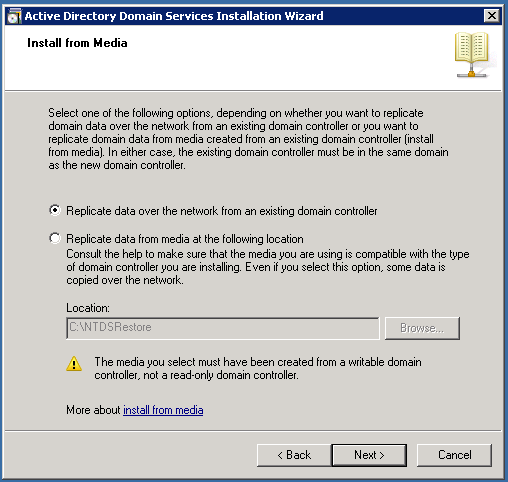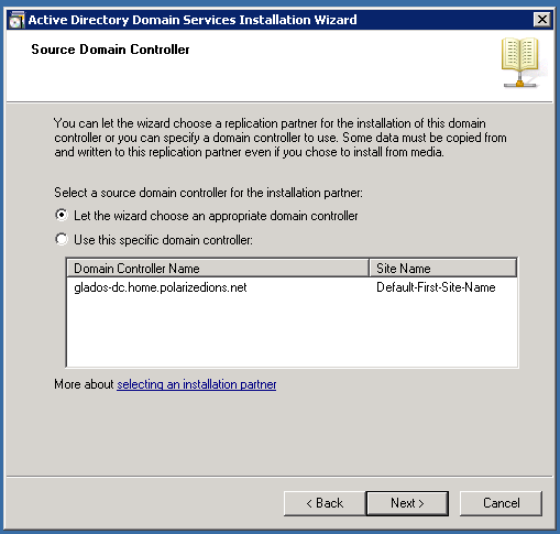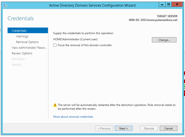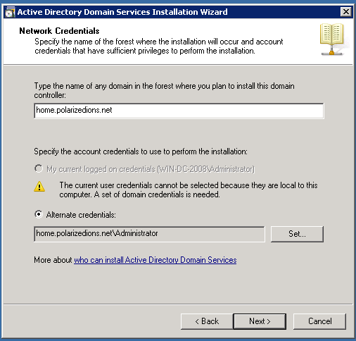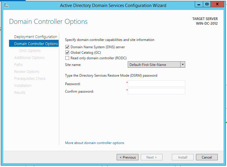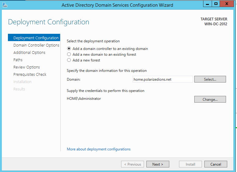 Specify “existing domain”, input the domain you’re joining, and the credentials to join it. NOTE: you may need to prefix your joining credentials with the domain, otherwise it might default to the local machine account. The DSRM password is that strong password you chose when setting up the 2008 server. You can hit next until install becomes available, and then hit that. It should complete within a few minutes. After closing the wizard, the VM will restart.