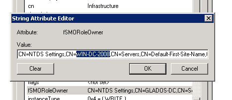 In the popup, the Connection Point should be DC=DomainDnsZones,DC=yourdomain,DC=tld, and the Computer should be the Samba Machine. Drill down the tree, until you see CN=Infrastructure on the right panel, and then open that. Search for the fSMORoleOwner key, and edit the ...CN=<samba name>,... to be the new windows 2008 name.