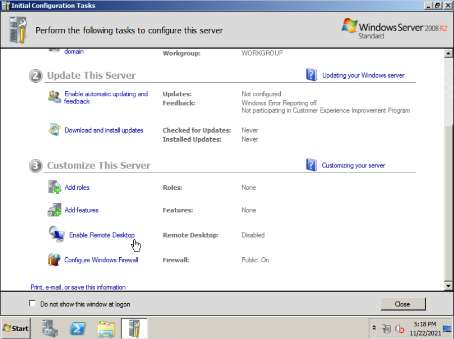 Next, give it a static ip, set the DNS server to that of the Samba DC, and give it a better hostname (eg. WIN-DC-2008), the latter of which requires a reboot. These can easily be accessed on the first steps of the Initial Configuration Tasks window that pops up.