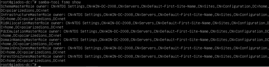 Re-running samba-tool fsmo show should now show all FSMO roles are transfered!