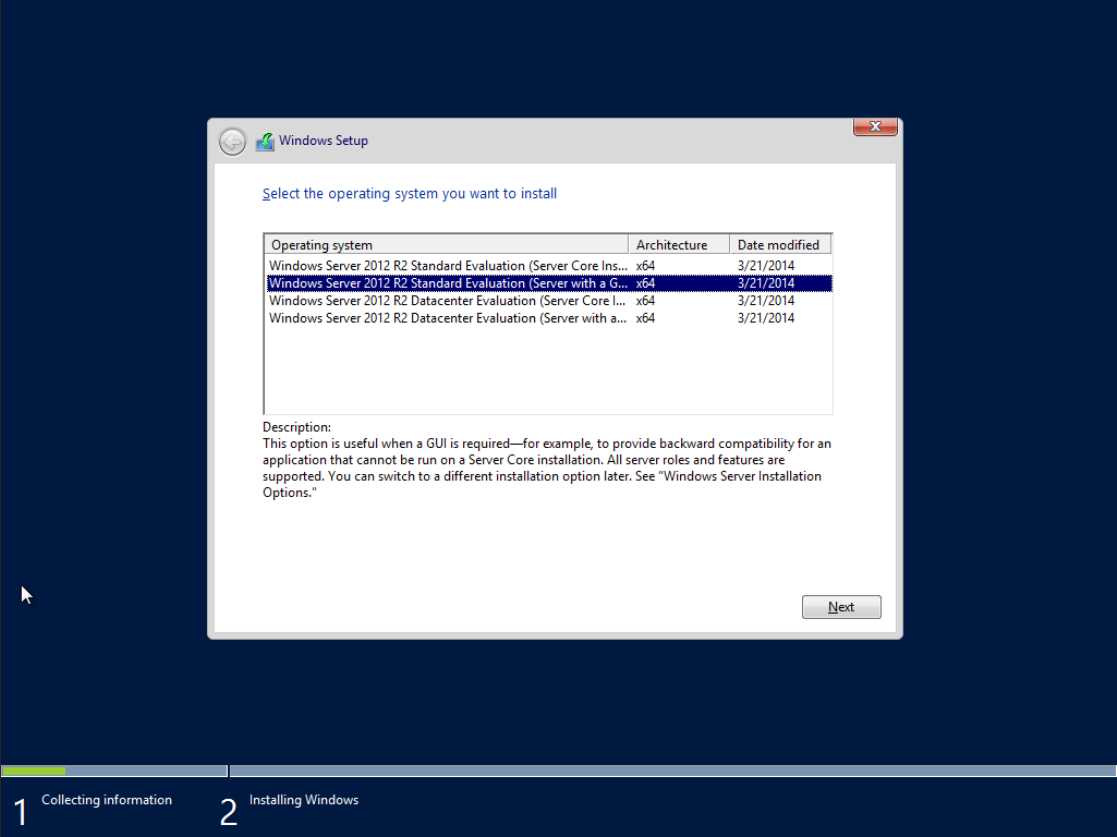 Our last step! Grab the ISO here, and install as per usual, remembering to select the “Desktop Experience”.