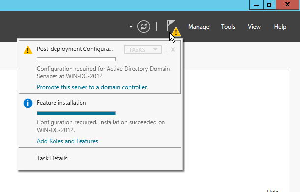 In Server Manager, hit the 2nd step, Add roles and features, and hit next until you reach the Server Roles step. Select Active Directory Domain Services, and hit next until install becomes available. Once that is done, hit Close, and restart.