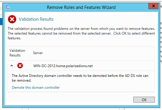 De-select “Active Directory Domain Services” when you get to that step. A popup should appear, saying that you need to demote it first. Click the “Demote this domain controller” link on the bottom.
